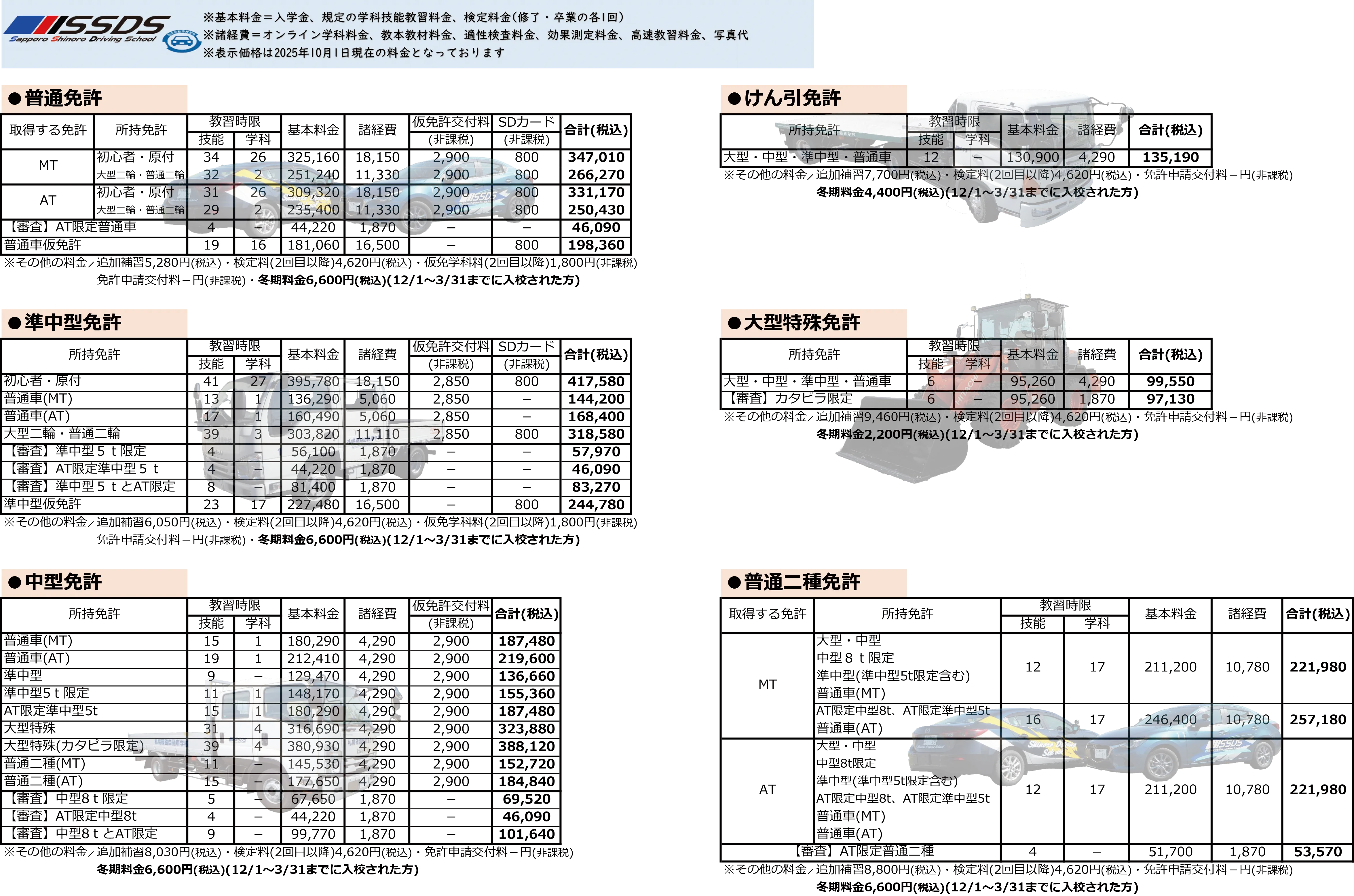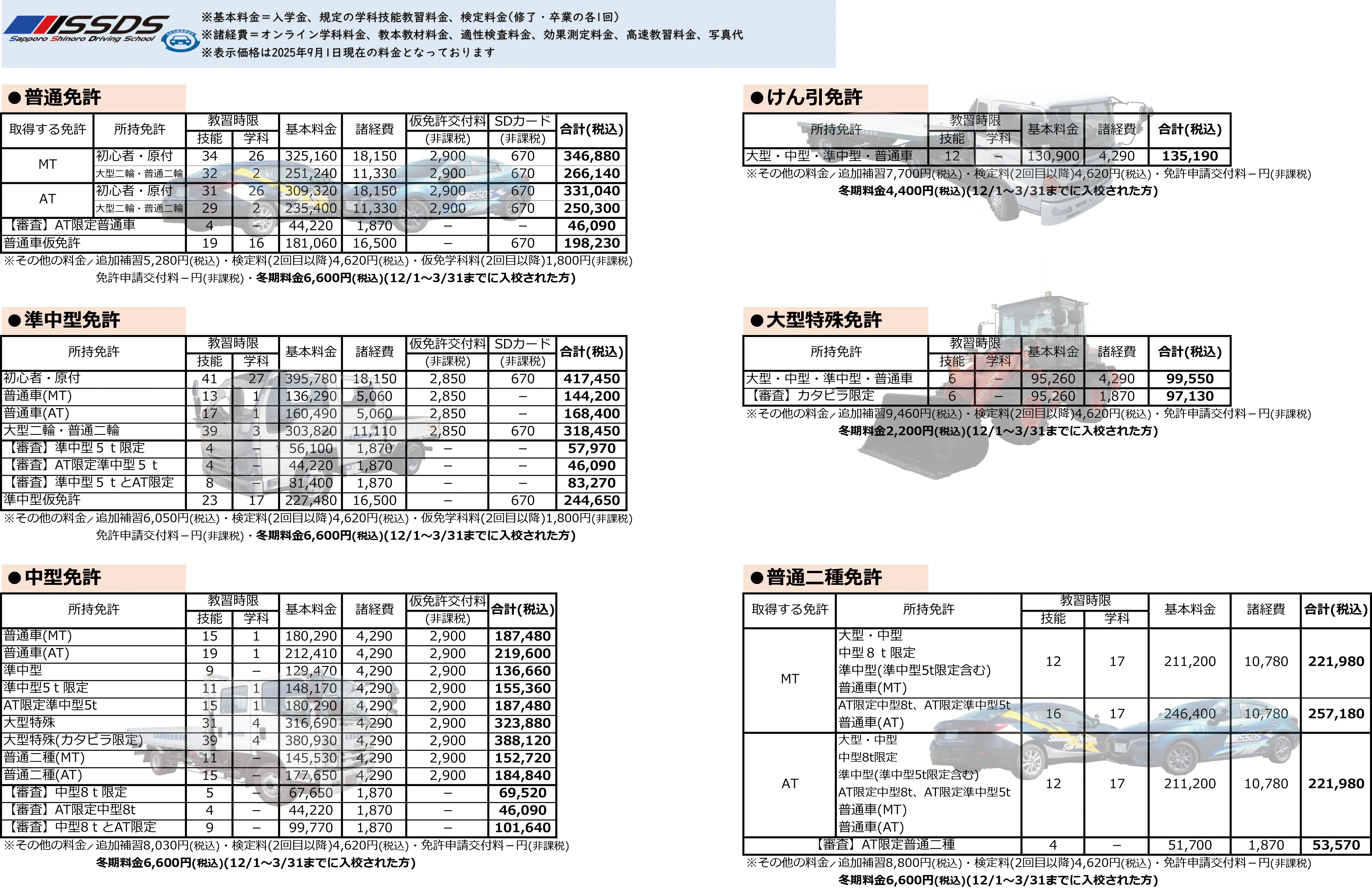 料金表(普通車・準中型・中型・けん引・大特・普通二種)
